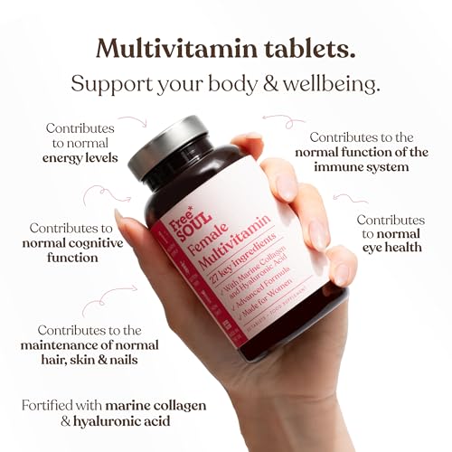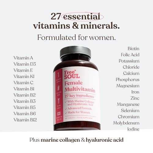 Women’s Multivitamins & Minerals with Marine Collagen & Hyaluronic Acid | 27 Essential Vitamins, Minerals, & Botanicals | Gluten-Free & No Synthetic Fillers or Binders | 60 Tablets | Free Soul