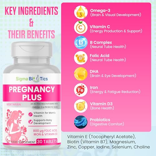 Pregnancy Tablets 20 Multivitamin with 800µg Folic Acid, D3, Iron, DHA, Omega-3, Probiotics Blend, Magnesium, All Trimester Pregnancy Support – 30 Vegetarian Tablets – One Month Supply