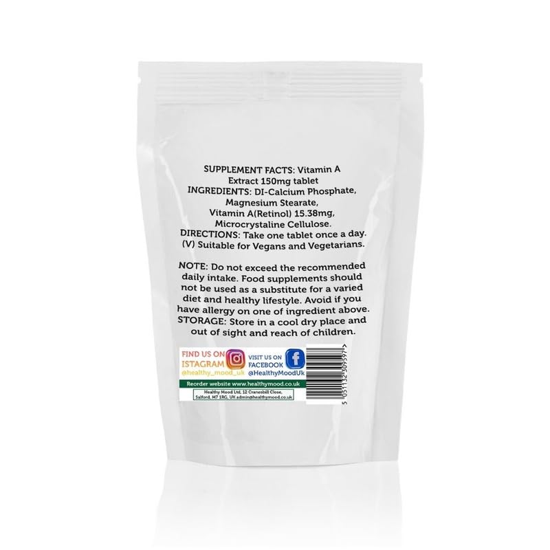 High Potency Vitamin A: Each tablet provides 150mg of Vitamin A, equivalent to 1500mcg (325,000 IU/g), ensuring a potent dose for maximum health benefits.