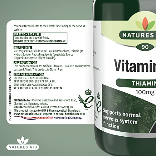 Natures Aid Vitamin B1 100mg Thiamine Tablets – High Strength Food Supplement – Supports Energy Metabolism, Nervous System, Heart & Mind – Vegan, Gluten-Free, Non-GMO – 90 Tablets