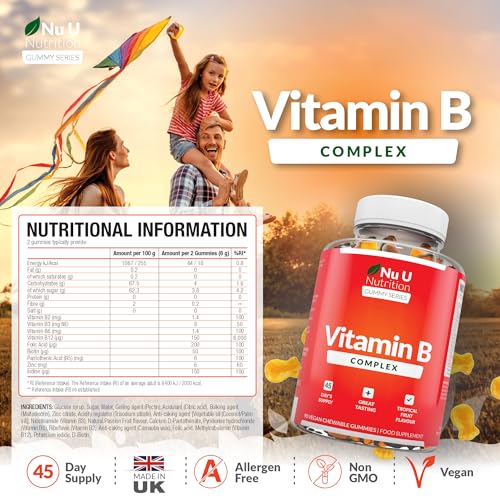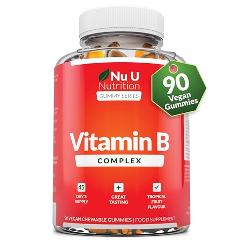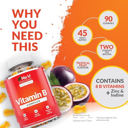 Vitamin B Complex Gummies for Adults & Kids (12+) – 90 Vegan Gummies – Tropical Fruit Flavour – High Strength Vitamin B2, B3, B5, B6, B8, B12, Folic Acid, Zinc & Iodine – Nu U Nutrition