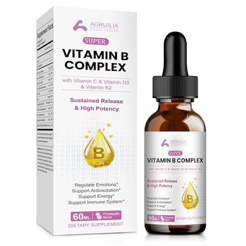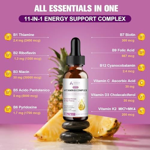 Vitamin B Complex Liquid Drops, 11 in 1 B Complex Vitamins High Strength with B1, B2, B3, B5, B6, B7, B9, B12 – Vitamin C, D3, K2 for Immune & Energy Metabolism, Brain & Heart Support, 60ml