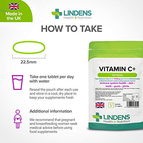 Lindens Vitamin C+ 1000mg – 120 Tablets – Time Release Tablets with Citrus Bioflavonoids and Rosehip – Contributes to Immune System Health, Reduces Tiredness and Supports Healthy Skin and Teeth