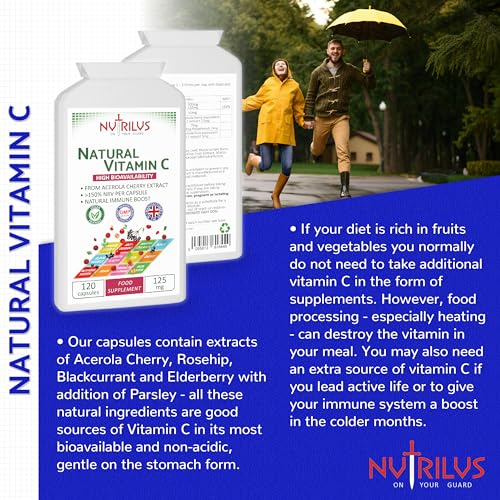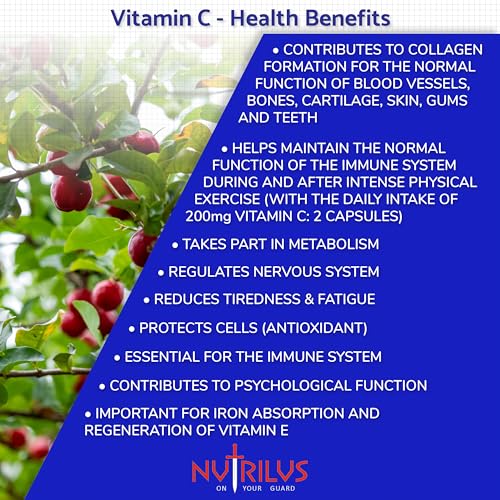Nutrilus Natural Vitamin C Capsules from Acerola Cherry 500mg Extract – High Bioavailability Supplement – not Ascorbic Acid – Fruit and Herbs Extracts – not Tablets (120 Capsules)