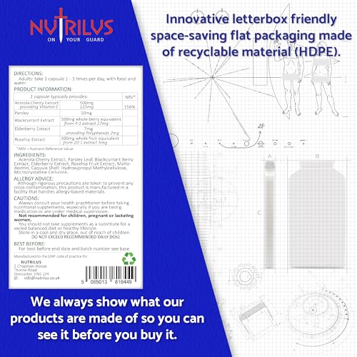 NATURAL SOURCES: The capsules contain natural (not lab-made) Vitamin C extracted from one of its richest sources: Acerola Cherry Fruit, with added Parsley, Blackcurrant, Elderberry and Rosehip. This gives you a gentler, more easily absorbable and more bioavailable form of the vitamin than the usual, common, synthetic one (Ascorbic Acid).