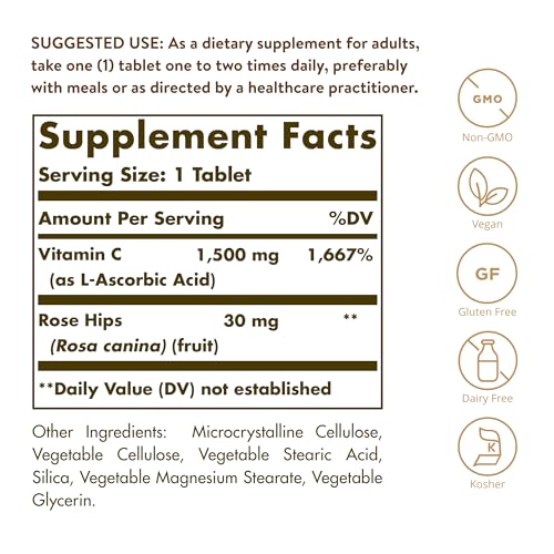 Solgar Vitamin C 1500mg with Rose Hips is a premium supplement suitable for vegans and just 1 tablet a day provides 1500 mg of Vitamin C and one of its synergistic counterparts, rose hips