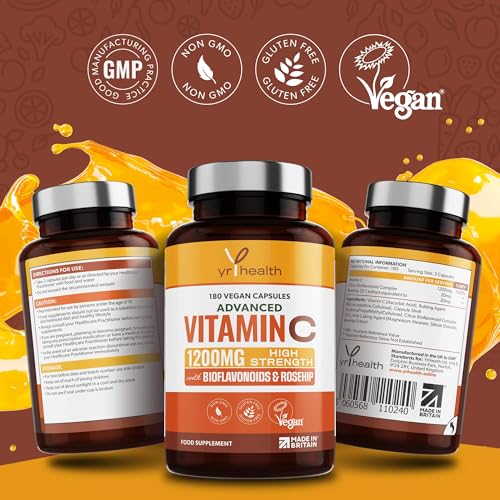Vitamin C 1200mg Immune Support with Bioflavonoids and Rosehip | 180 Vegan Vitamin C Capsules not Tablets | Slow Release VIT C Ascorbic Acid | Made in The UK by YrHealth