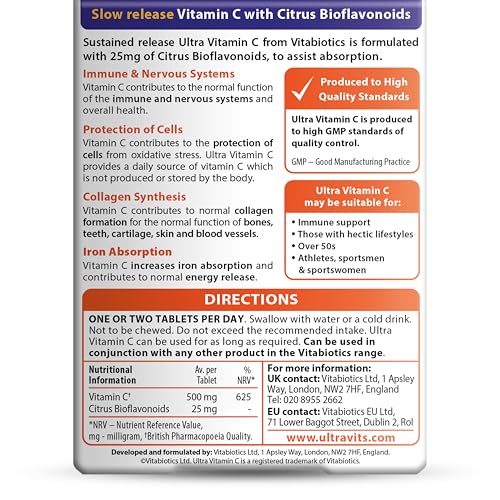 Ultra Vitamin C provides slow release vitamin C formulated with 25mg of citrus bioflavonoids, for maximum absorption and effectiveness. Ultra Vitamin C provides antioxidant support and contributes to normal function of the immune and nervous system. It increases non-haem iron absorption, the mineral essential for healthy blood formation and also supports normal collagen formation.