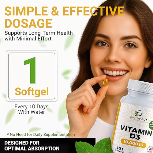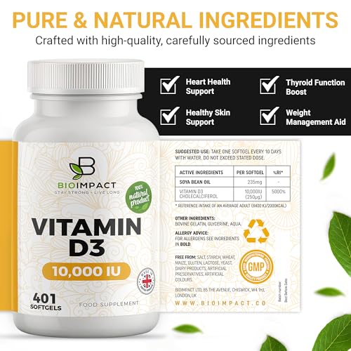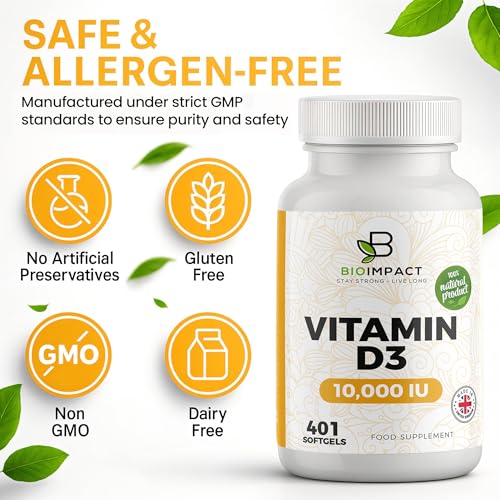 BIOIMPACT Vitamin D3 10,000 IU Softgels | High Strength | 401 Easy to Swallow Softgels | More Than Full Year Supply | Supports Immune System & Bone Health | Non-GMO & Gluten-Free | UK Manufactured