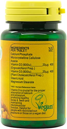 Ingredients per tablet: Calcium Phosphate, Microcrystalline Cellulose, Acacia, Vitamin D2 (800iu – Ergocalciferol Preparation) 20µg, Vitamin D3 (800iu – Plant Cholecalciferol Preparation) 20µg, Stearic Acid, Magnesium Stearate