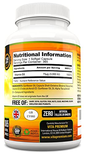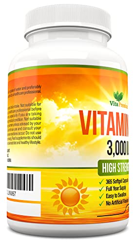 FULL YEAR’S SUPPLY – Take just one 3,000 IU Vitamin D3 softgel capsule per day – no need to remind yourself to take multiple tablets throughout the day. For your convenience, each bottle includes 365 softgels. This gives you a full year’s supply, so you won’t need to re-order again for at least a year.