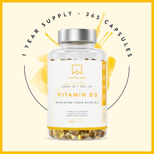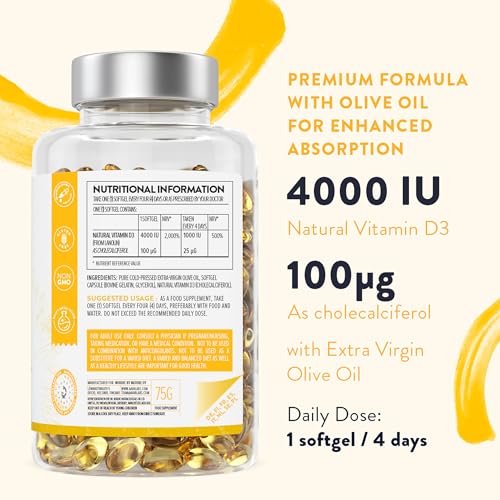 Vitamin D3 4000 IU – with Extra Virgin Olive Oil for Optimum Absorption – High Strength Vitamin D Supplement Contributes to Bone, Muscle and Immune Function – 365 Vitamin D Capsules