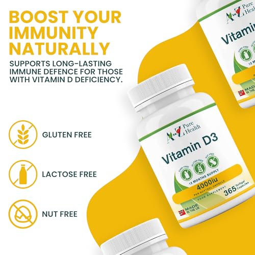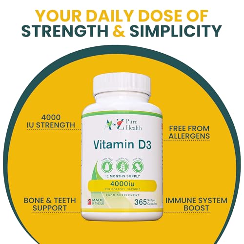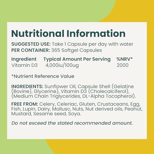 Vitamin D3 4000iu 1 Year Supply | Premium High Strength Supplement | 365 Easy to Swallow Softgel Capsule | One a Day, Year Supply | Supports Healthy Bones, Teeth, Muscle and Immune System | UK Made