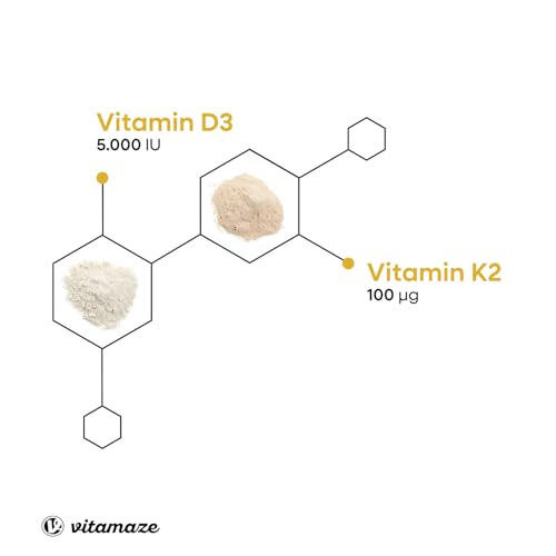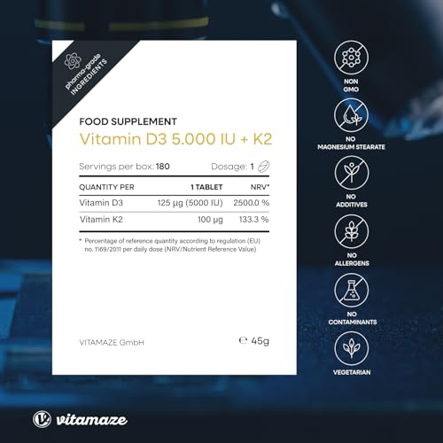 Vitamin D3 K2 5.000 IU & 100ug (MK7) 180 High Strength Vitamin D3 K2 Tablets for 6 Months Supply of Vitamin D3 and K2 for Bone, Teeth, Muscle Function & Immune System. German Quality. Vitamaze®