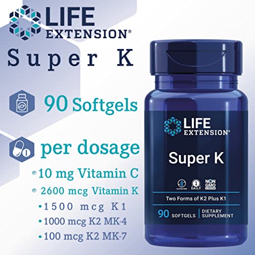 Life Extension, Super K, Vitamin K-Complex with MK-7, Depot, High Dose, 90 Softgels, Laboratory Tested, Gluten-Free, SOYA-Free, Non-GMO, 2.600mcg Vitamin K