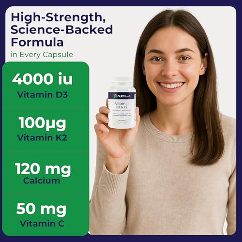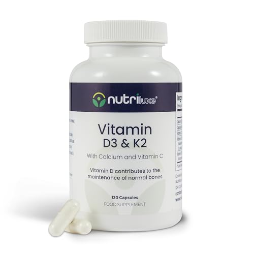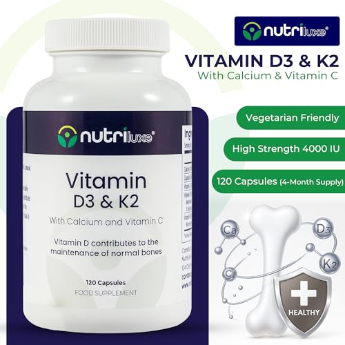 Nutriluxe Vitamin D3 4000 IU + K2 (MK-7) 100µg with Vitamin C & Calcium | High Strength Vegetarian | Supports Bone, Joint, Fatigue & Immune System | 120 Capsules | UK Made