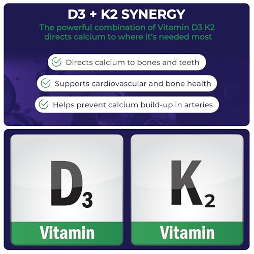 D3 + K2 SYNERGY – The powerful combination of Vitamin D3 K2 directs calcium to where it’s needed most—your bones and teeth—preventing harmful deposits in arteries, making our high strength vitamin D3 and K2 better for cardiovascular and bone health.
