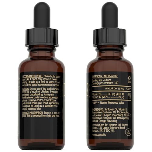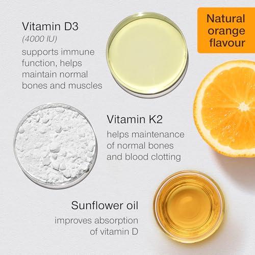 HIGH STRENGTH SUPPLEMENT WITH LONG-LASTING VALUE – Each 4-drop serving delivers 4000 IU of Vitamin D3 and 25 mcg of K2 MK-7 for powerful daily support. With around 600 drops per 30 ml bottle, you’ll enjoy up to 5 months of consistent use. The clean, vegetarian-friendly formula includes sunflower seed oil, natural orange flavour, and essential vitamins — with no unnecessary additives.