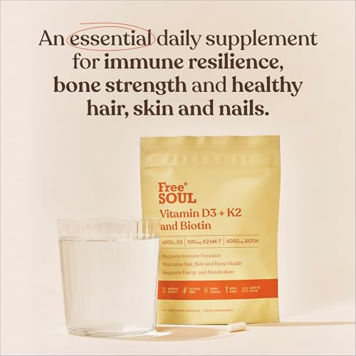 Vitamin D3 + K2 and Biotin, 3 in 1 Complex | High Strength D3 4000IU, K2 MK-7 & Biotin 6000mcg | Immunity, Heart, Hair, Skin, Nails, Support | UK Made | Lab-Tested | 90 Capsules | Free Soul