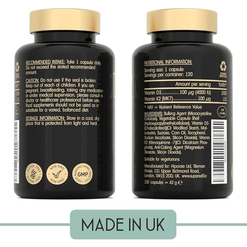 ️FOUR MONTH SUPPLY – Make taking your vitamins easy, safe and convenient. SuperSelf high strength Vitamin D3 K2 supplement uses the superior cholecalciferol form of vitamin D3 (4000 IU) and the menaquinone MK7 form of vitamin K2 (100µg), so you need just 1 capsule daily. This packet contains 120 capsules, enough for 4 months.