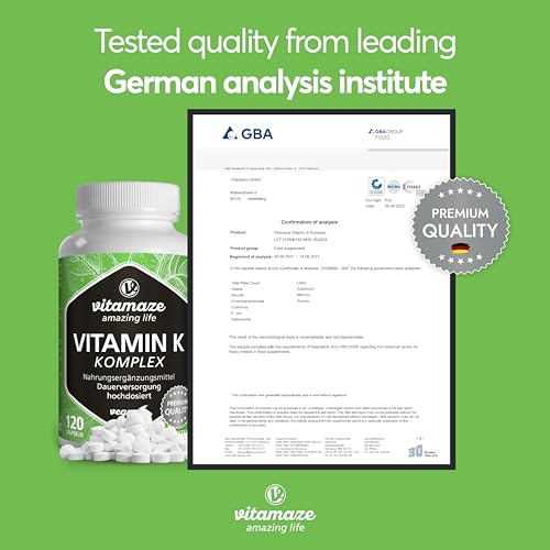Vitamin K2 + K1 Complex – High Strength (K1 1.000 mcg MK4 + K2 200 mcg MK7 Menaquinone) – 120 Vegan Capsules for 4 Months – Best Bioavailability Supplement – Without Additives- Vitamaze