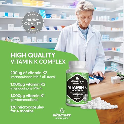 HIGH DOSED: 120 vegan capsules for 4 months continuous supply of 2.200 mcg of high quality vitamin K per capsule. Contains 200µg vitamin K2 (Menaquinone MK-7 all-trans) ideally combined with 1.000µg vitamin K2 (Menaquinone MK-4) and 1.000µg vitamin K1 (Phytomenadion) as complex.