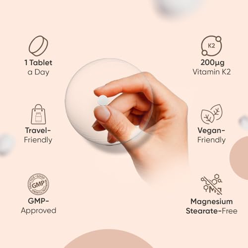 EASY-TO-SWALLOW TABLETS: A practical choice for staying on track with Vitamin K2 MK-7. These K2 tablets come in a convenient tablet form with a smooth, easy-to-swallow coating for a hassle-free experience. With no need for mixing or measuring, they offer a simple and practical choice. Whether at home or on the go, they fit effortlessly into any routine, making consistency easy.