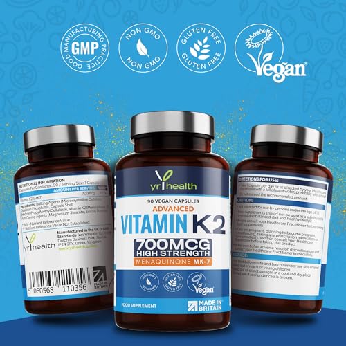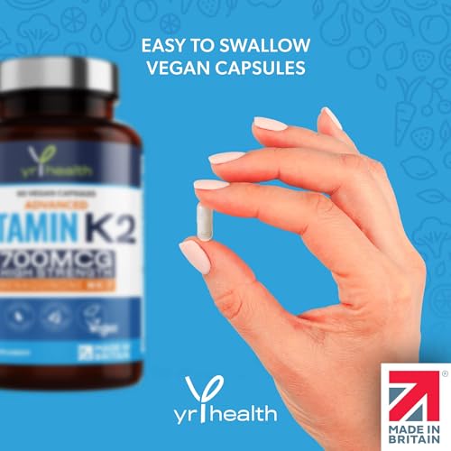 Vitamin K2 MK7 700mcg – High Strength Vitamin K2 Menaquinone – 90 Vegan Society Registered Capsules Not Tablets – Made in The UK by YrHealth
